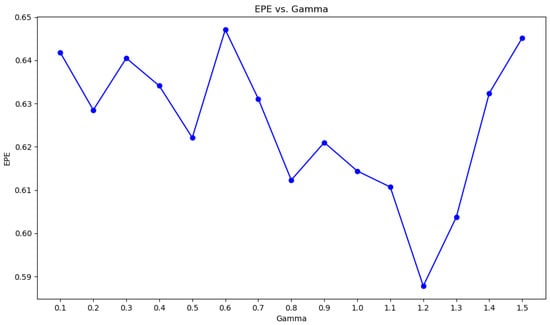 The baseline of the model in this paper is GwcNet. In the experiment, the LSE-CVCNet network parameters include the following: the adjustment factor of local structure entropy ; the window size of local entropy ; the cost-volume update weight ; parameter of loss function = 1; and the value of is obtained through several tests, as shown in Figure 3. It can be seen that, when , the value of EPE is the smallest.