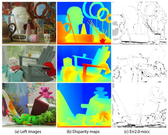 Some test results of the Middlebury V3 data set shown in Figure 14 show three different indoor scenes, including complex geometry, lighting conditions, and various textures. The parallax map shows the depth information of the object, showing continuity and smoothness in most areas, but the effect needs to be improved in areas where the light changes violently, with object edges, and with background areas with insufficient texture.
