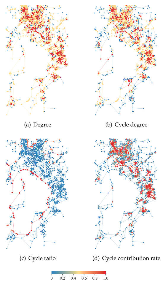 42] proposed the use of the cycle ratio (the summation of co-cycle rates among nodes sharing the same cycle with the target node) as a metric to assess the importance of nodes, comparing it with the results obtained from degree, H-index, and coreness. Experiments on real-world networks suggest that the cycle ratio contains rich information in addition to well-known benchmark indices. However, we measured the importance of nodes based on their cycle ratio in the road network. The results showed that nodes having higher cycle degrees (defined as the number of minimum cycles related to the node) within large cycles were prone to having a higher cycle ratio; however, this method could not effectively identify the central nodes in the road network. To solve this problem, we will introduce the concept of cycle contribution rate (taking into account both the quantity and length of cycles associated with each node) to assess node importance. The reason lies in the calculation differences between the cycle ratio and the cycle contribution rate. The former sums over all co-cyclic nodes in the entire network, amplifying the influence of large cycles; while the latter only accumulates contributions from directly associated cycles, emphasizing that small cycles contribute more significantly than large ones. In summary, existing network analysis methods based on cycles exhibit a lack of systematization and mathematical rigor. Notably, in graph theory, the concept of a minimum cycle basis has been proposed and applied to the analysis of small-scale networks [