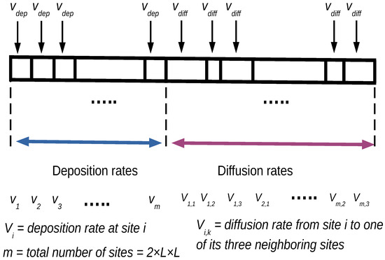 Monte Carlo methods are used as computational tools in many areas of physical chemistry. Although traditionally applied to obtain equilibrium properties, MC methods can also be used to study dynamic phenomena [43,44]. In the KMC method, every step consists of a random selection of one of many possible processes. The probability of a process being selected is directly proportional to its rate, which is represented as a fraction of a segment containing all processes that may occur in the system (see Figure 1). The rates of all possible processes are stored in an array of length , where is the total number of surface sites (where each component of the array is associated with a rate equal to if the site is available or 0 if it is not, i.e., when the site or one of its three neighboring sites is occupied), and is the total number of possible diffusion movements from each site to one of its three neighboring sites (where each component of the array is associated with a rate equal to —different for each environment—if there is a particle that can diffuse or 0 otherwise). Using a random number, the next process to occur is selected with a probability proportional to its rate.