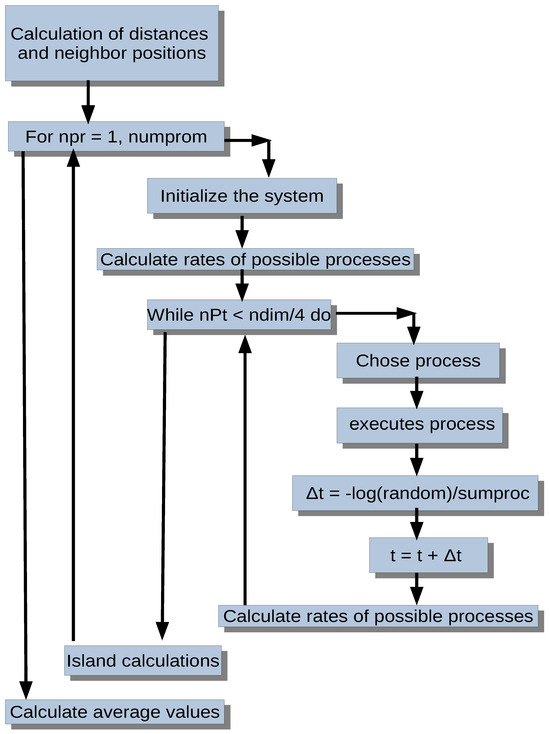 Once the randomly chosen process has occurred, all possible processes are calculated and stored again in the corresponding fraction of the segment, and a time increment of is added, where u is a random number between 0 and 1, and is the sum of the rates of all possible processes. This choice of the time increment is due to the assumption that we are dealing with a Poisson process [42,43,44]. A general flowchart of the employed algorithm is shown in Figure 2.