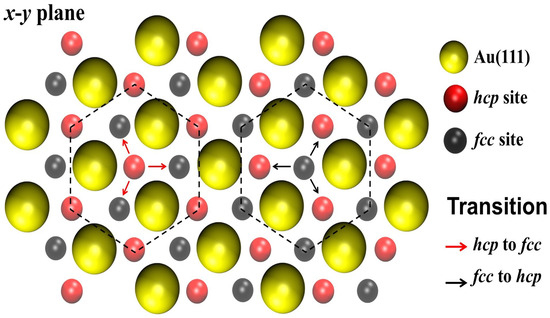The adsorption and diffusion of atoms on surfaces are modeled using kinetic Monte Carlo simulations. Surface alloys and multilayers are not allowed, since only one monolayer or submonolayer of atoms is considered. Two kinds of adsorption sites can be occupied by atoms: hollow hcp (hcp = “hexagonal close-packed”; refers to hollow sites with a gold atom in the layer below the upper one) or hollow fcc (fcc = “face-centered cubic”; refers to hollow sites without any atom in the layer below the upper one).