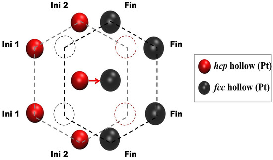 Figure 4 shows a schematic representation of the diffusion process for a atom from one type of site to a neighboring site of the other type. The eight surrounding sites taken into account in the calculation of the velocity are shown and differentiated with the following labels: and for sites next to the initial site (which are of the same type as the initial site, either fcc or hcp) and for the four sites next to the final site (which are of the same type as the final site and opposite to the type of the initial site).