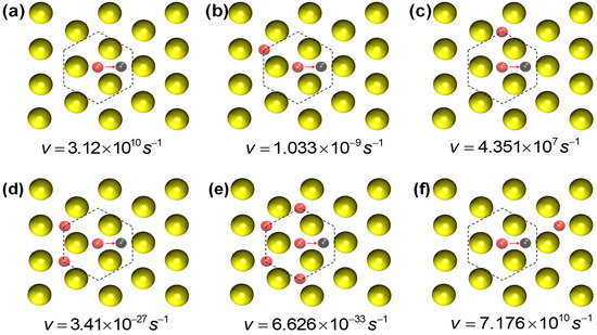 Taking into account the parameters indicated in Table 1 and the activation energy calculated according to Equation (5), the velocity for each possible diffusion event was calculated as . Here, the considered temperature was K, so eV.