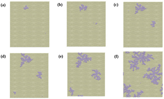 KMC simulation of the deposition of on for and s−1. Frames show the morphology of the submonolayer adsorbed on the surface at different times. Yellow: gold atoms. Violet: platinum atoms. (a) s. (b) s. (c) s. (d) s. (e) s. (f) s.