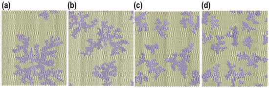 KMC simulation of the deposition of on for and different deposition rates . Frames show the final state of the simulation for the coverage degree . Yellow: gold atoms. Violet: platinum atoms. (a) s−1. (b) s−1. (c) s−1. (d) s−1.