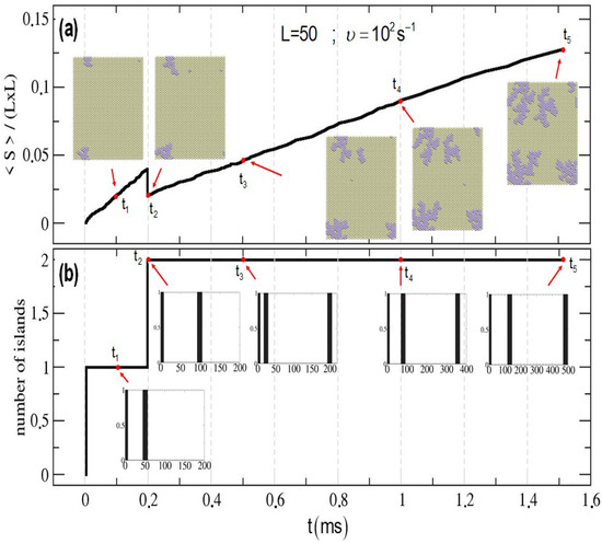Figure 8 and Figure 9 show the time evolution of the average island size (normalized by the system size) and the total number of islands for two cases used as examples: a system size and a deposition rate s−1 (Figure 8), and a system size and a deposition rate (Figure 9). Snapshots of the state of the surface and histograms for the island distribution are also included for selected times.