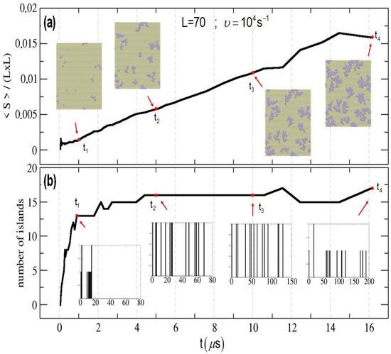 For the simulation shown in Figure 9, as the system size is larger and the deposition rate is higher, a larger number of smaller islands than in the previous example is observed. The total number of islands initially increases, corresponding to a nucleation and growth stage, and for times around s, this number remains more or less constant, corresponding to a growth stage (the existing islands continue growing in size, but no new islands are formed).