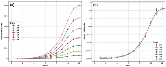In Figure 10a, it can be seen that the total number of islands increases with the deposition rate. The system size also influences the number of islands. But, as can be seen in Figure 10b, when the island density is considered (the number of islands normalized by the system size), the different curves overlap, except for the case when (and to a lesser extent for ), where the density is higher than that observed for the other system sizes. This shows that finite-size effects are only evident for the smallest system sizes but are negligible for most of the system sizes considered here.