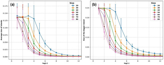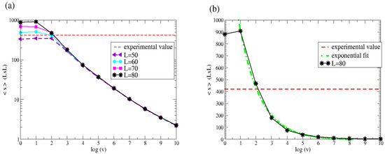 Figure 13 shows a plot of the average island sizes (the same cases as in Figure 11a, but multiplied by ), together with the value corresponding to the experimental case. In Figure 13a, the four largest system sizes are shown together on a logarithmic scale on the y-axis, and it can be seen that, except for the lower values of , the system size effects are negligible.