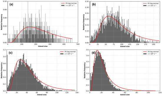 where S represents the island size, is the mean value of the logarithm of the island sizes, and is the standard deviation. The red curves in Figure 12 correspond to the fitting of the numerical data to Equation (9), and the parameters and are given in Table 2.