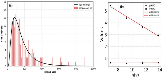 (a) Histogram of the -on- cluster population, adapted from [18]. (b) Relationships between the parameters and obtained from the log-normal fit of the KMC simulations and the logarithm of the deposition rate. The parameter values fitted for the experimental size distribution are and .