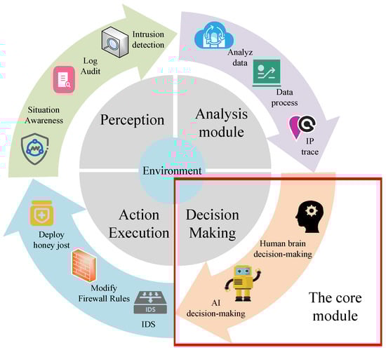 Autonomous cyber defense technologies, by integrating artificial intelligence, game theory, and optimization algorithms, have demonstrated significant potential to address complex and dynamic cyber attack scenarios. As shown in Figure 1, the basic framework of autonomous cyber defense is focused on the decision-making module, which is crucial to enabling agents to make quick and effective decisions. To achieve intelligent and autonomous cyber defense, scholars have begun integrating reinforcement learning with game theory to further optimize autonomous cyber defense strategies, thereby promoting the development of autonomous cyber defense technologies.