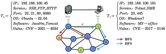 The parameter p controls the probability of revisiting the just-visited vertex. Note that p only applies to the case where , which means that vertex x is the vertex that just visited before the current vertex u. If p is high, the probability of revisiting the just-visited vertex will be low, and vice versa. The parameter q controls whether the walk is outward or inward. If , the random walk tends to visit vertices close to u, favoring BFS, which helps capture local neighborhood information and quickly identify direct vulnerabilities of the current node, such as open ports and unpatched vulnerabilities. If , it tends to visit vertices far from u, favoring DFS, which helps to explore the global network structure. By using the DFS strategy, defenders can anticipate that attackers may penetrate core data through multi-hop nodes and discover potential cross-subnet attack paths.