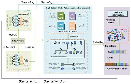 In the study of autonomous cyber defense decision-making, we select the PPO reinforcement learning algorithm as our core methodology. Compared to traditional policy gradient methods, PPO mitigates the issues of policy oscillation and low sample efficiency inherent in those algorithms. It does so by introducing policy update step constraints and objective function clipping techniques. It significantly enhances sample collection efficiency through multi-threaded parallel environment sampling. This feature is particularly critical for dynamic and uncertain cyber attack–defense scenarios. For details on PPO, see the work of Schulman [34]. Our design for the observation space of the defensive agent consists of two parts: one is the boolean alerts information generated by the original attacker behaviors, and the other part is the node embeddings generated by Node2vec representing the network topology. After representing the network topology information using the Node2vec model, we input the resulting embeddings into the policy network of the PPO algorithm, along with the alerts generated in the network environment. These combined inputs form the observation of the agent, expressed as . The core of the Node2vec-PPO algorithm lies in optimizing the following policy objective function: