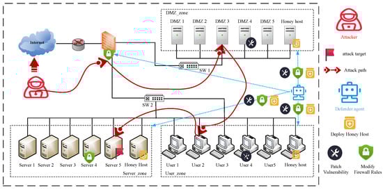 where represents the utility of the i-th attackers and represents utility of the j-th defenders and is constrained by the state space of the game, the actions, strategies, and information of both parties. Similarly, this paper considers . As researchers of the autonomous cyber defense decision-making method, this paper considers the effectiveness of the designed method for autonomous defenders, so this paper mainly considers the utility of the blue intelligent agent. When taking actions in state , the blue intelligent agent receives a reward , which can be positive or negative. The negative value primarily arises because the defensive actions taken by the blue team may not immediately stop the attacker’s actions but will consume defense resources. For example, when deploying decoys, the red team’s target may not necessarily be the decoy host.