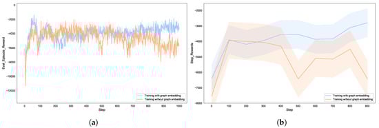 The effects of with or without graph embedding on the utility of autonomous defense agent: (a) reward for each episode; (b) reward for steps.