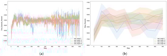 The effects of embedding processes with different walk lengths on autonomous defense agent: (a) reward for each episode; (b) reward for steps.