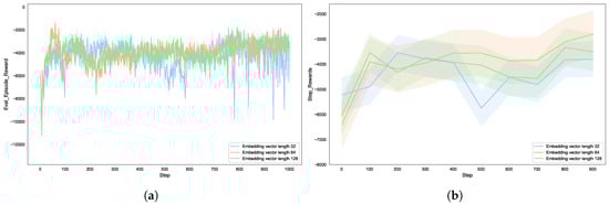 The effect of different embedding vector lengths on autonomous defense agent: (a) reward for each episode; (b) reward for steps.