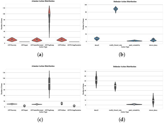 Distribution statistics of actions in offensive and defensive strategies under different p parameters: (a) 1000-episode evaluation of attacker action distribution under parameter ; (b) 1000-episode evaluation of defender action distribution under parameter ; (c) 1000-episode evaluation of attacker action distribution under parameter ; (d) 1000-episode evaluation of defender action distribution under parameter .