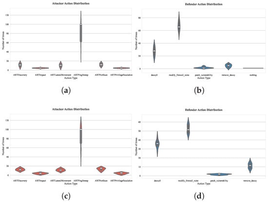 Distribution statistics of actions in offensive and defensive strategies under different q parameter strategies: (a) 1000-episode evaluation of attacker action distribution under parameter ; (b) 1000-episode evaluation of defender action distribution under parameter , ; (c) 1000-episode evaluation of attacker action distribution under parameter ; (d) 1000-episode evaluation of defender action distribution under parameter .