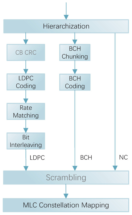 Bose–Chaudhuri–Hocquenghem (BCH) codes, although less frequently used in MLCM systems than LDPC codes, can still be useful in specific scenarios. The BCH algorithm can be quickly implemented in hardware by the look-up table method. Compared with the iterative decoding of LDPC, BCH codes consume less energy for short code lengths (). Its error correction efficiency is close to the theoretical optimum, which complements the excellent performance of LDPC codes with long code lengths. BCH codes avoid the redundancy overhead of LDPC long codes if the data block of a coding layer is small in MLCM. Moreover, compared with LDPC decoding, BCH codes have negligible decoding complexity in some specific code length and code rate cases [28,29].
