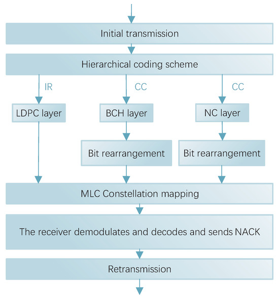 When the BCH layer and the NC layer perform the CC method, the transmitter sends BCH-encoded or non-encoded message bits in the initial transmission, and the receiver receives them and then checks them for errors. If an error is detected, error correction is attempted. If error correction is not possible, the demodulated LLR is stored in the cache and a NACK is sent back to the transmitter. After receiving the retransmission signal, the transmitter performs a bit-reverse-ordering operation on the bits in order to perform a rearrangement operation. Then, it retransmits them again. The transmitter receives and demodulates the LLR and combines it with the LLR of the initial transmission in the cache end; it then decodes on this basis, and the receiver verifies whether the received data are correct or not. This allows the system to benefit from retransmission and reordering.