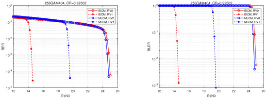 The performance curves of the Bit Error Rate (BER) and Block Error Rate (BLER) of the layered scheme 256QAM404 at code rate are shown in Figure 6. In the figure, “MLCM, RV0” represents the performance curve of the initial transmission of MLCM system, and “MLCM, RV1” represents the performance curve of one retransmission of MLCM system. The comparison shows that the primary retransmission brings about 5 dB retransmission gain to the MLCM system, which verifies the practical application effect of the IR + CC retransmission scheme in the MLCM system that was achieved in this paper.