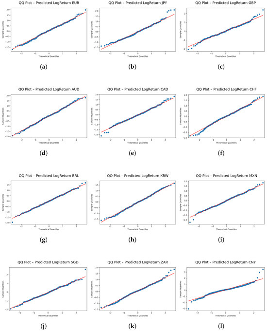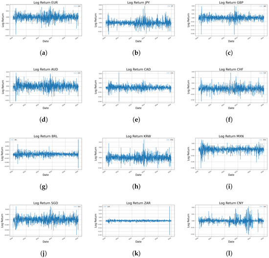 Log return for each ticker from 1 January 2020 to 31 December 2024. (a) EUR, (b) JPY, (c) GBP, (d) AUD, (e) CAD, (f) CHF, (g) BRL, (h) KRW, (i) MXN, (j) SGD, (k) ZAR, (l) CNY.
