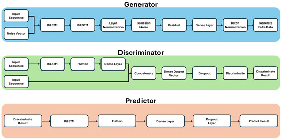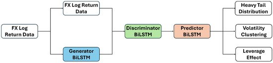 Figure 2 presents the overall structure of the FINGAN-BiLSTM model, while Figure 3 details the internal architecture of each generator, discriminator, and predictor module. The main hyperparameters and training configurations for these components are summarized in Table 2. Here, “G” denotes the generator network, “D” the discriminator network, and “P” the predictor network. Sequence length L, input scaling, and batch size were held constant across all experiments. The noise dimension and BiLSTM depth in the generator were tuned to enhance diversity while preserving temporal context, whereas discriminator and predictor dropout rates were set low to maintain adversarial balance and forecasting robustness. Training was performed using Adam optimizers with separate learning rates and moment coefficients (, ) for G, D, and P, with AMSGrad enabled for the generator. Gradient clipping (norm = 1.0) was applied to prevent exploding gradients, and regularization weights for auxiliary loss, drift penalty, and gradient penalty were selected based on a preliminary RMSE-guided grid search to ensure stable convergence and faithful reproduction of FX return stylized facts.