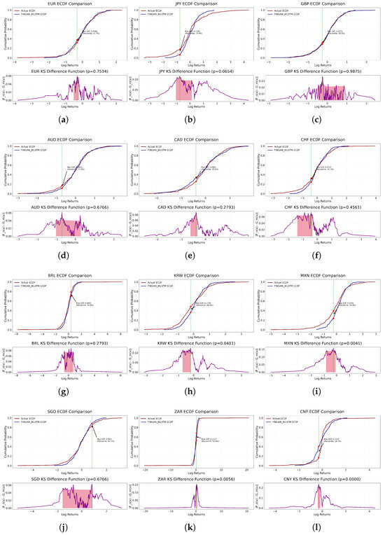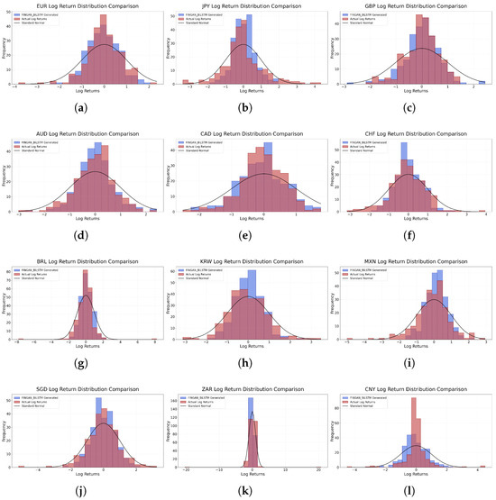 In this section, we present the prediction results for the 12 FX return series using the FINGAN-BiLSTM model. First, we generate synthetic return distributions and compare them with the corresponding real return distributions. Subsequently, we evaluate the quality of the synthetic data by examining its adherence to key stylized facts commonly observed in financial time series, namely heavy-tailed, volatility clustering, and leverage effects.