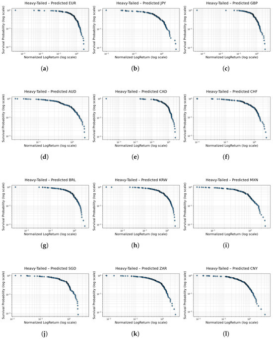 Table 1 provides the basic descriptive statistics for the daily log returns of 12 major and minor currency pairs, such as the Euro (EUR), Japanese yen (JPY), British pound (GBP), Australian dollar (AUD), Canadian dollar (CAD), Swiss franc (CHF), Brazilian real (BRL), Korean won (KRW), Mexican peso (MXN), Singapore dollar (SGD), South African rand (ZAR), and Chinese yuan (CNY). Overall, the average returns are exceedingly close to zero. For example, the EUR exhibits an average return of −0.0001, the JPY −0.0003, and the GBP approximately zero. Although the differences are subtle, these figures suggest that each currency pair displays distinct return characteristics in response to the evolving market and economic conditions.
