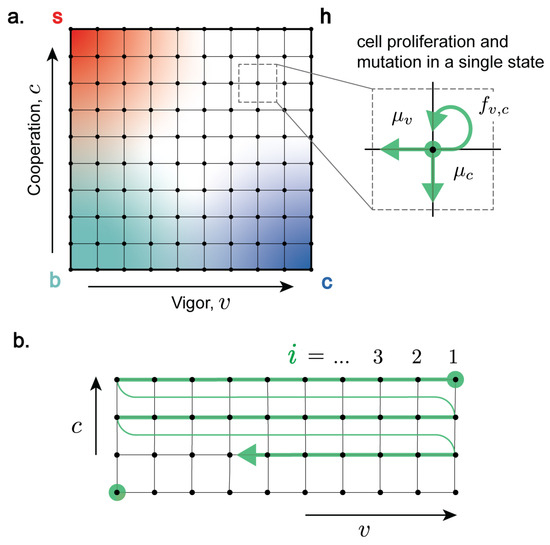 We describe the system dynamics on this two-dimensional coordinate system as a the result of (i) cell proliferation (via intercellular competition) with replication rate f v , c , which depends on state ( v , c ) according to Equation (3), and (ii) somatic mutations that affect vigour or cooperation. We assume that mutations change either v or c in single steps with rates μ v and μ c for senescence- and cancer-causing mutations, respectively, as in our previous work, where we found that results from a continuous model were not qualitatively different [33]. Moreover, mutations in v and c are independent from each other, and we do not account for complex genetic interactions, e.g., epistatic interactions.
