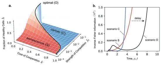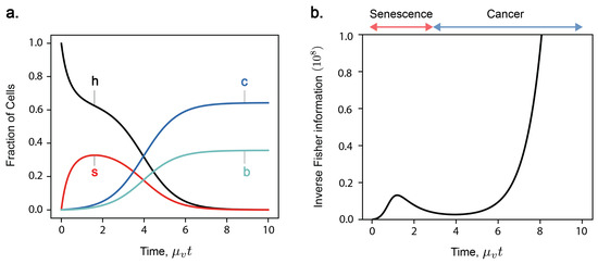 More information about the parameter λ means a lower bound on the variance of the estimator λ ˜ , and thus higher precision. In our model, Fisher information quantifies how much information a sample of cell fractions ρ i = { h , s , c , b } provides about current time t (Figure 4). Figure 2b shows the time evolution of inverse Fisher information 1 / I ( t ) for the four-state model. The evolution of 1 / I ( t ) displays features which represent key phases in the model: initial accumulation of senescent cells, a transition from senescence to cancer, and late-stage proliferation of cancer at late times. At t = 0 , we have complete knowledge about the initial condition where all cells are healthy; thus, the inverse Fisher information vanishes. A detection of cancerous or senescent cells would indicate that cell populations have evolved beyond this initial state. Therefore, as senescent cells start to accumulate, the inverse Fisher information increases. A transient decrease in inverse Fisher information then follows during the transition from senescence- to cancer-domination, when the rate of population change is the greatest. According to Equation (23), this minimum in 1 / I ( t ) suggests an optimal inference of t. Finally, inverse Fisher information diverges as cancer cells proliferate and, eventually, we reach a steady state between c and b cells. This can be explained by cell demographics reaching a steady-state (thus, zero information rate), and also by the inability to infer true time during the steady state based on a measurement (Fisher information and statistical inference).
