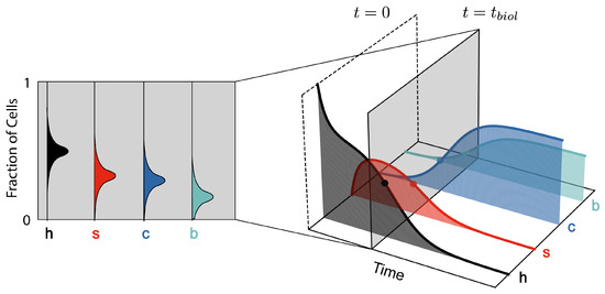 The population dynamic model Equation (1) describes multicellular ageing as an inevitable consequence of the trade-offs between cell competition and cooperation, where the selective pressures for individual cell proliferation conflict with those for maintaining organismal vitality, an idea discussed in [14]. Figure 1a shows an example of the time evolution of cell fractions for a four-state model, where n = m = 1 . In this case, cells can be in one of four states: healthy (‘h’), senescent (‘s’), cancerous (‘c’), and both senescent and cancerous (‘b’). The dynamics of the four-state cell model unfold in two distinct phases due to the separation of timescales between mutation rates affecting senescence and cancer development. Initially, we observe a first phase where senescent cells accumulate, driven by senescence-causing mutations. Subsequently, the system transitions into a slower second phase, where senescent cells are incrementally eliminated due to the onset of cancer-causing mutations and the selection pressures from non-cooperative cancer cells. As a result, the fraction of cancerous cells begins to increase, displaying a sigmoidal growth curve that eventually plateaus. At the end, healthy and senescent cells always tend to zero, leaving a steady-state of only cells in states c and b.