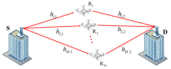 The entire communication system includes M parallel paths, and each path contains two hops. For the first hop, node S transmits the same signal to M UAV relay nodes; the signal received by UAV relay node can be written as