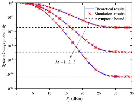 Figure 6 shows the OP versus for different when and . As seen in the figure, the OP gradually decreases as is increased for a given . However, when is large, the OP performance does not improve as increases, but tends to different asymptotic bounds due to different values. This indicates that the system’s OP performance cannot always be improved by increasing without limitation, which verifies the accuracy of Remark 1.