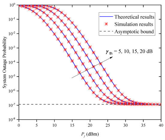 Figure 5 shows the OP versus for different SNR threshold values when and . It can be observed from the figure that when is small, the system’s OP performance becomes worse as the increases, which suggests that a better OP performance for the system can be obtained by reducing the value of . In addition, when is large, the OP curves of the system tend to the same asymptotic bound, which is independent of and the SNR threshold , thus verifying Remark 1.