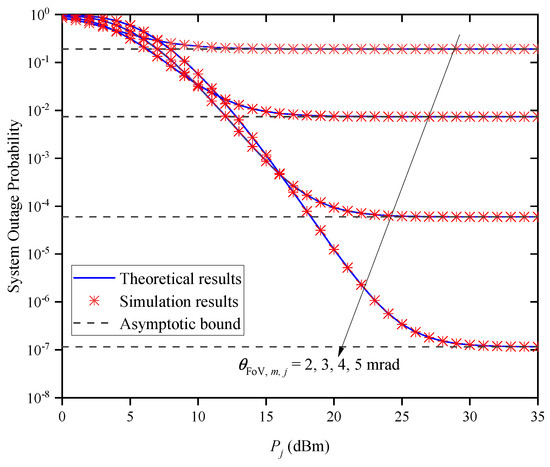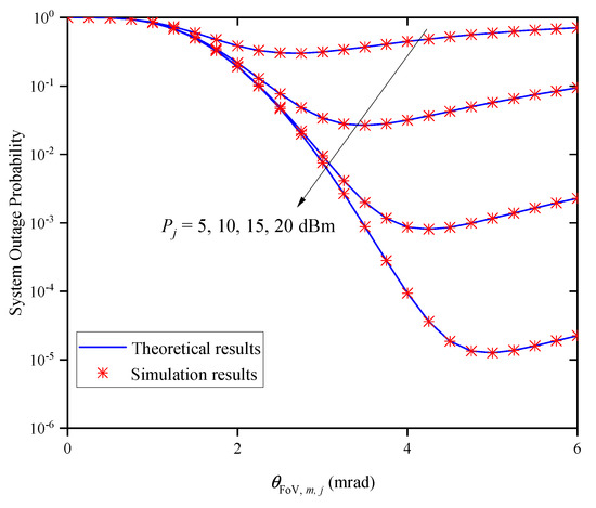 By observing (25), it can be found that when the average transmit optical power and are sufficiently large, increasing the optical power does not further improve the outage performance of the system. In this case, the OP of the system is only related to the number of UAV relay nodes M, FoV , and the standard deviation of the direction deviation .