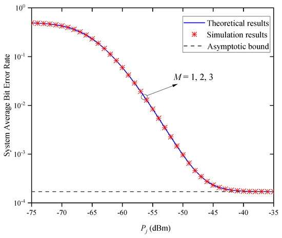 Figure 9 shows the system’s ABER versus for different numbers of relay nodes M when and . It can be seen that the system’s ABER gradually decreases with the increase in for a given M value. Under the same transmitted optical power condition, the system’s ABER does not change with the increase in M, because the system ABER is equal to the ABER of a single path and is independent of M, when the states of each path are independent and identically distributed. Moreover, the system ABER does not decrease with the increase in , but approaches the same asymptotic bound. This indicates that increasing the cannot always improve the system’s ABER performance, which verifies the accuracy of Remark 2.