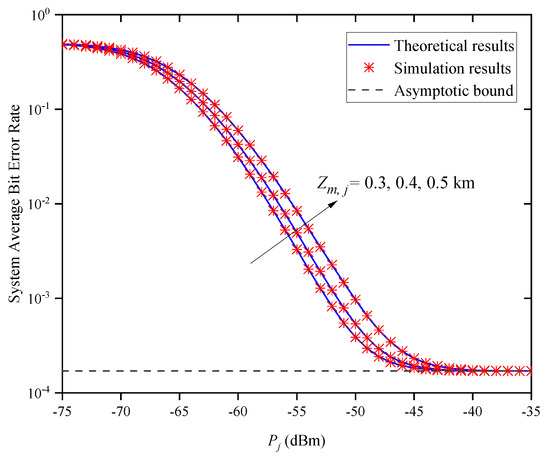Figure 10 shows the system’s ABER versus for different when and . In Figure 10, the system’s ABER dramatically decreases with the decrease in when is small. This is obvious because the shorter the link transmission distance is, the better the channel quality is. However, when is large, the system’s ABER does not continuously decrease with the increase in , but gradually approaches the asymptotic bound, which verifies the accuracy of (37). This phenomenon suggests that when is large enough, the average transmitted optical power does not affect the system’s ABER. Moreover, the system’s ABER curves approach the same asymptotic bound when is large; that is, the asymptotic bound is independent of and the parameter that affects the system’s ABER is no longer , which verifies the accuracy of Remark 2.