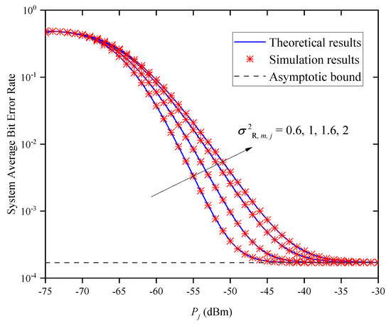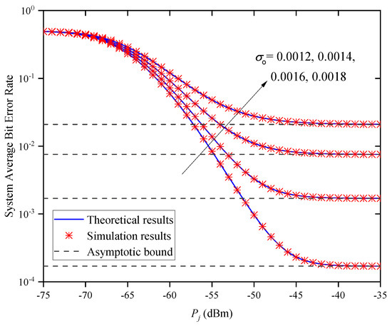 Figure 14 shows the system ABER versus for different standard deviations of the direction deviation when and . In this figure, we find that the system’s ABER decreases with the increase in for a given . Under the different conditions, the system’s ABER increases with the increase in . This indicates that we can obtain a smaller ABER by reducing the value of . In addition, when is large, the system’s ABER does not decrease with the increase in but approaches different asymptotic bounds because of different values of . This indicates that the system’s ABER cannot always be decreased by increasing , which verifies the accuracy of Remark 2.