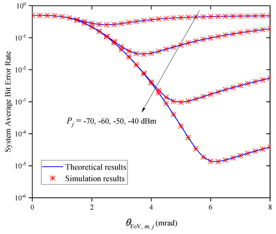 Figure 13 shows the system’s ABER versus the FoV for different values of when and . In this figure, we find that the system’s ABER decreases first and then increases as increases for a given . This indicates that there is an optimal value for obtaining the minimum system ABER, and the optimal value increases gradually with the increase in .