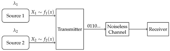 During idle channel periods, arriving symbols are quantized and then assigned binary prefix-free codewords by an encoder. These compressed symbols are then sent to the receiver through a shared noiseless channel at a rate of one bit per unit time, while any new arrivals generated during channel busy periods are discarded. Therefore, the transmission time of a symbol is equal to its assigned codeword length, and our system can be modeled as a multi-source (multi-stream) M/G/1/1 non-preemptive system [18]. We assume that the receiver can identify the corresponding source of the symbols received.