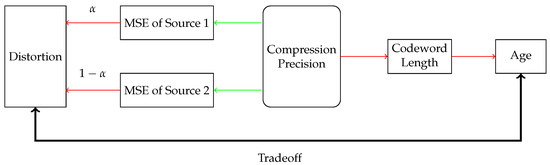 Age–distortion tradeoff schematic diagram in multi-source system. Blocks connected by green (red) arrows represent opposite (same) trend of quantity growth or decrease.