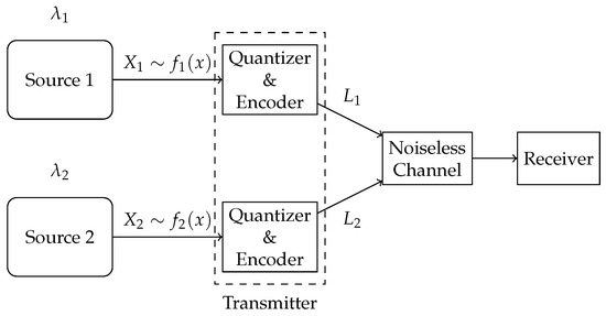 We propose two compression schemes—a multi-quantizer compression scheme, where a dedicated quantizer–encoder pair is assigned to each source for compression, and a single-quantizer compression scheme, employing a unified quantizer–encoder pair shared across both sources, as shown in Figure 3 and Figure 4, respectively. The difference between the two schemes lies in their required number of quantizer–encoder pairs. The multi-quantizer compression scheme offers greater design flexibility, as it can be designed separately for each source. In contrast, the single-quantizer compression scheme requires only one quantizer–encoder pair, whose design is dependent on the characteristics of both sources simultaneously, potentially limiting its performance.