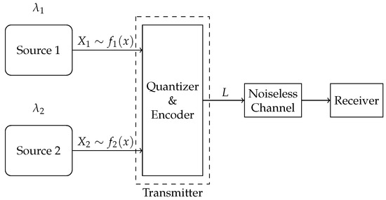 In the single-quantizer compression scheme, the symbols generated by both sources are compressed by a shared quantizer–encoder pair. Therefore, the design of this pair depends simultaneously on both sources.
