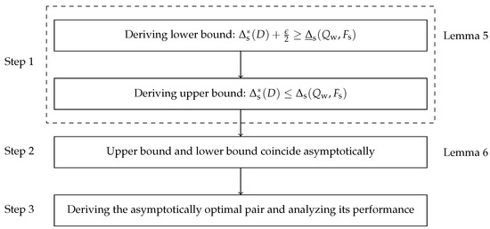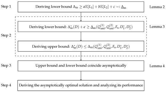 The proof of Theorem 1 proceeds as follows: First, a lower bound of the AoI is constructed, which decouples the design of codeword length assignments for both sources. Then, we obtain the upper and asymptotically lower bounds of the optimal AoI through (i) allocating appropriate distortion to each source and (ii) designing the corresponding quantizer–encoder pair. We further prove that the two bounds are tight asymptotically. During this process, to avoid directly solving Problem (8), the performance of the Shannon encoder is used to approximate the solution of (8) in the high-resolution regime. Finally, we prove the asymptotically optimality of the solution and analyze its performance. The proof flowchart of Theorem 1 is shown in Figure 5.