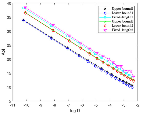 For the single-quantizer compression scheme, we employ the w-quantizer with its corresponding Shannon code. The resulting AoI—plotted as the green curve—is the upper bound of the optimal AoI, while the asymptotically lower bound is plotted as the red curve. We observe that the gaps between the upper and lower bounds for both schemes are remarkably small. As the quantization step size decreases, the gaps asymptotically approach zero, confirming Lemmas 4 and 6. In addition, four curves exhibit asymptotically linear behavior with the same slope of , confirming Theorems 1 and 2. Furthermore, while maintaining the previously described quantizer structures, we evaluate the performance of fixed-length encoding for the multi-quantizer compression scheme (light blue curve) and the single-quantizer compression scheme (magenta curve). As we can observe, significant performance gaps exist between fixed-length encoding and the theoretical asymptotic optimum for both schemes. Additionally, the single-quantizer scheme (magenta curve) exhibits jitter at low bit rates. This jitter phenomenon stems from the design principle of the w-quantizer, which inserts about quantization points within each interval on the basis of the uniform quantizer with cell size . At low bit rates (where is large), cannot be treated as a constant within each interval, leading to poor approximation performance. As decreases, this jitter effect gradually diminishes and eventually disappears when the quantization becomes sufficiently fine.