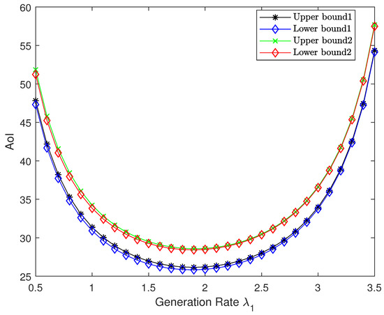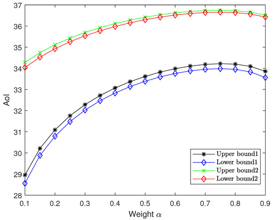 Figure 9 analyzes the effect of the weight on the optimal AoI performance for both schemes in the high-resolution regime. The arrival rates for sources 1 and 2 are set to and , respectively. The step size is set to . We vary from 0.1 to 0.9 in steps of 0.05 and plot the upper and the asymptotically lower bounds. Our results reveal that the bounds exhibit concave behavior with respect to , with as the unique maximum, confirming Propositions 2 and 3.